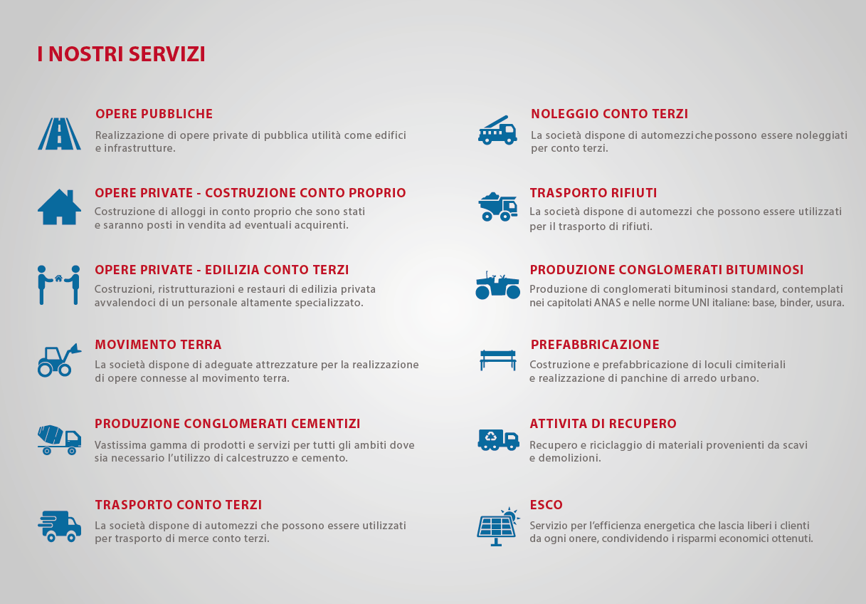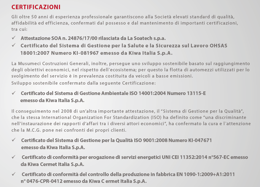 Gli oltre 50 anni di esperienza professionale garantiscono alla Società elevati standard di qualità, affidabilità ed efficienza, confermati dal possesso e dal mantenimento di importanti certificazioni